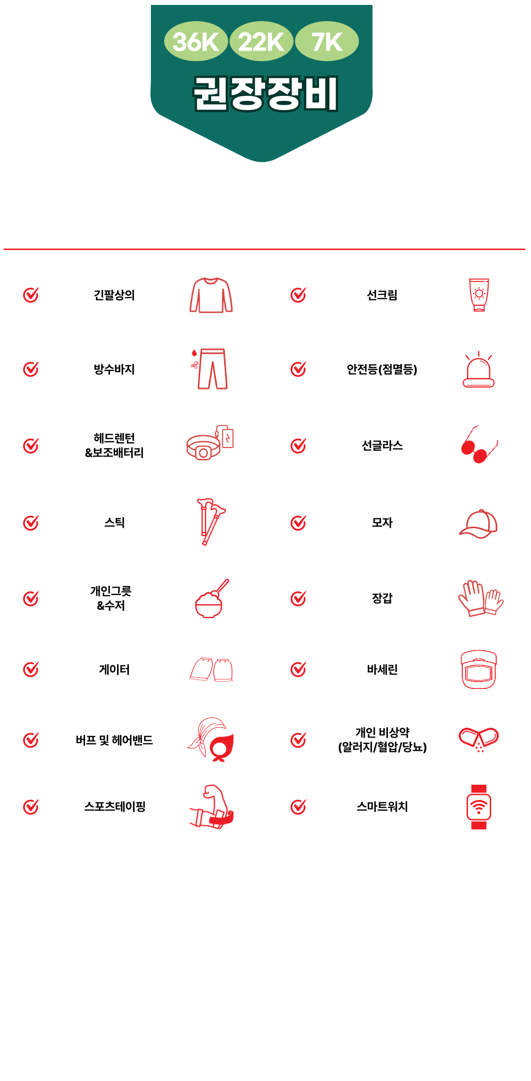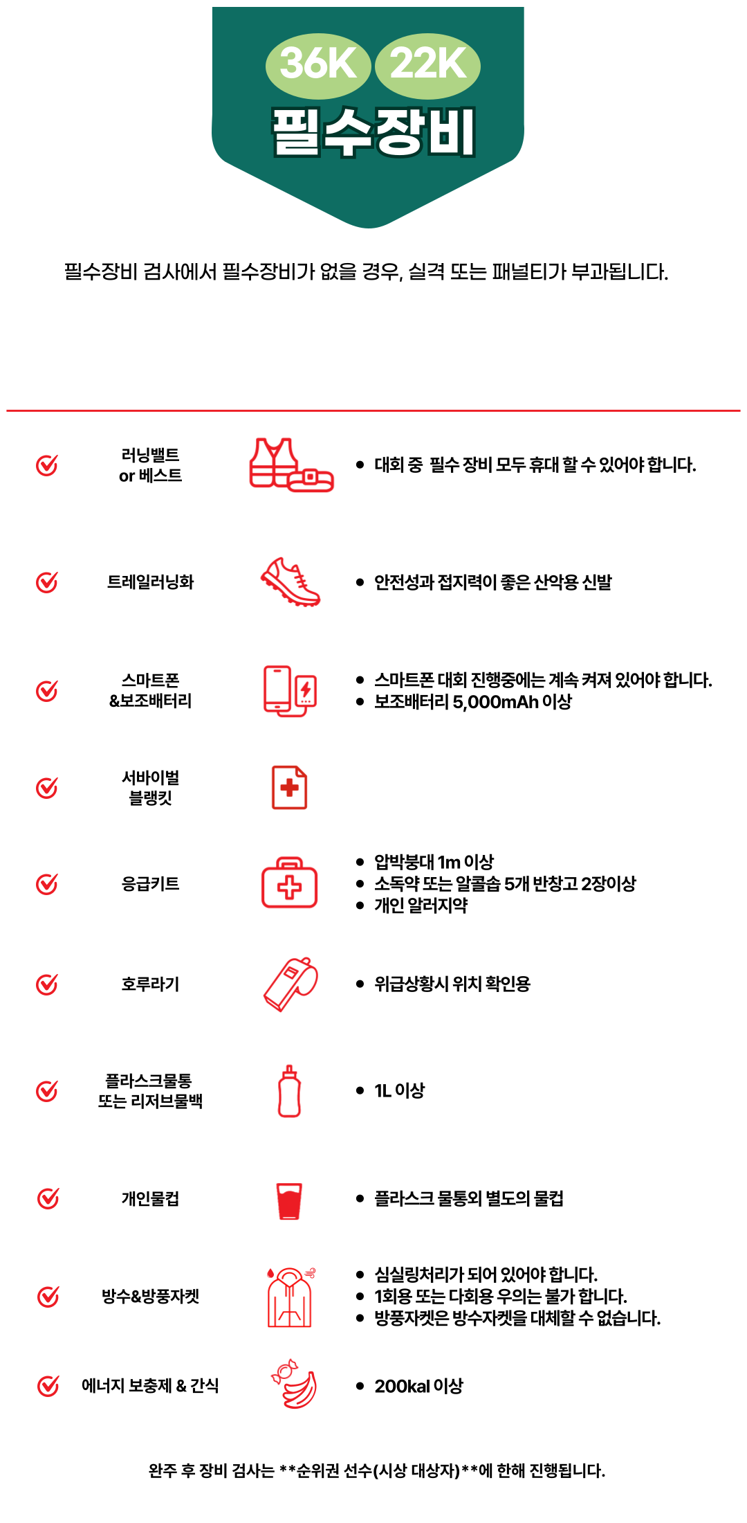 | 베스트 or 벨트 | 트레일러닝화 | 물통 1.0L 이상 | 개인컵 | 서바이벌 블랭킷 |